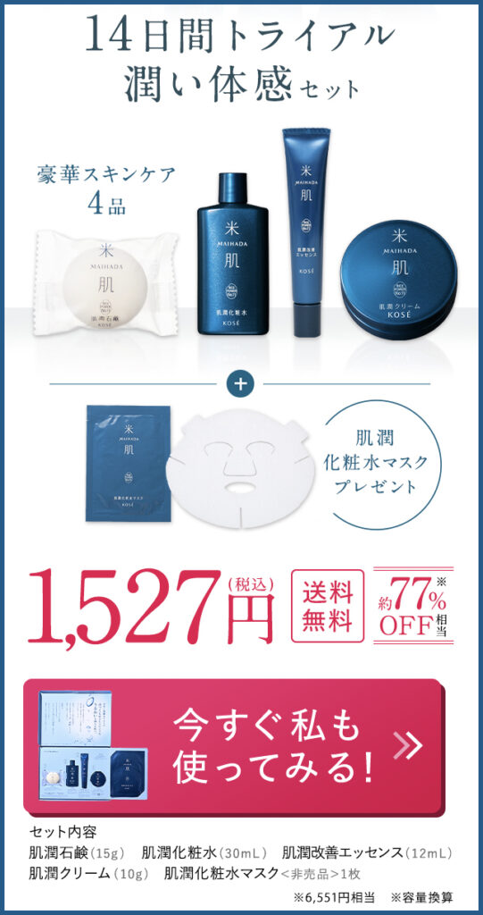 お試しで米肌を使い始めてから毎日がエステ後のような肌です。ほうれい線の悩みがにこの豪華セットで見違えるのは本当に驚きました!しかも、買い切りで試せるのは嬉しすぎます!